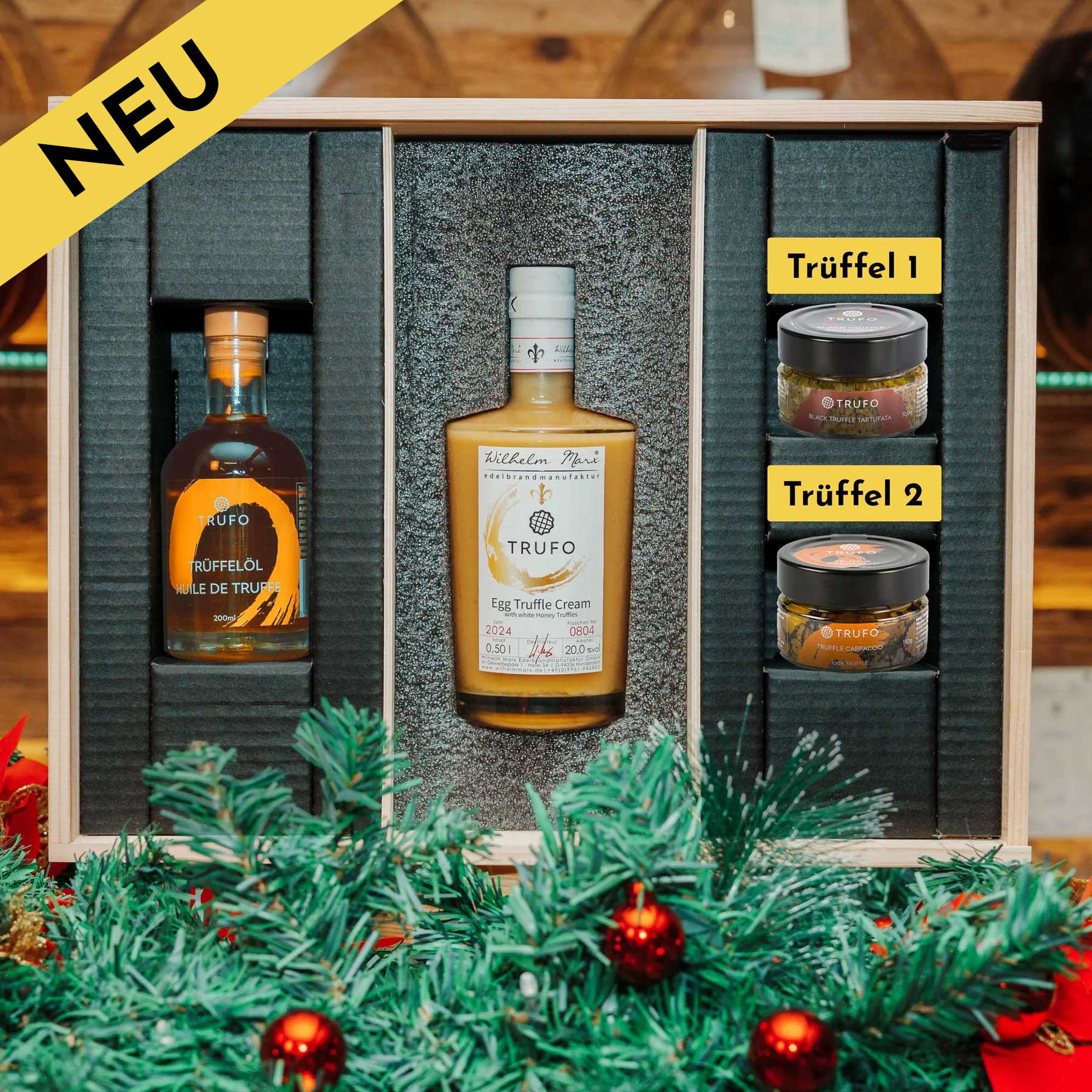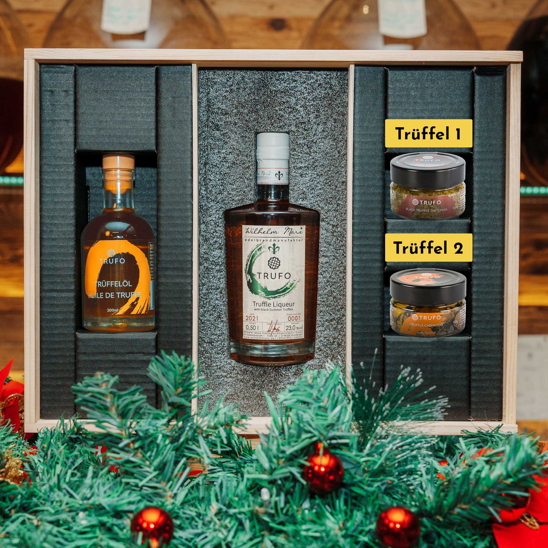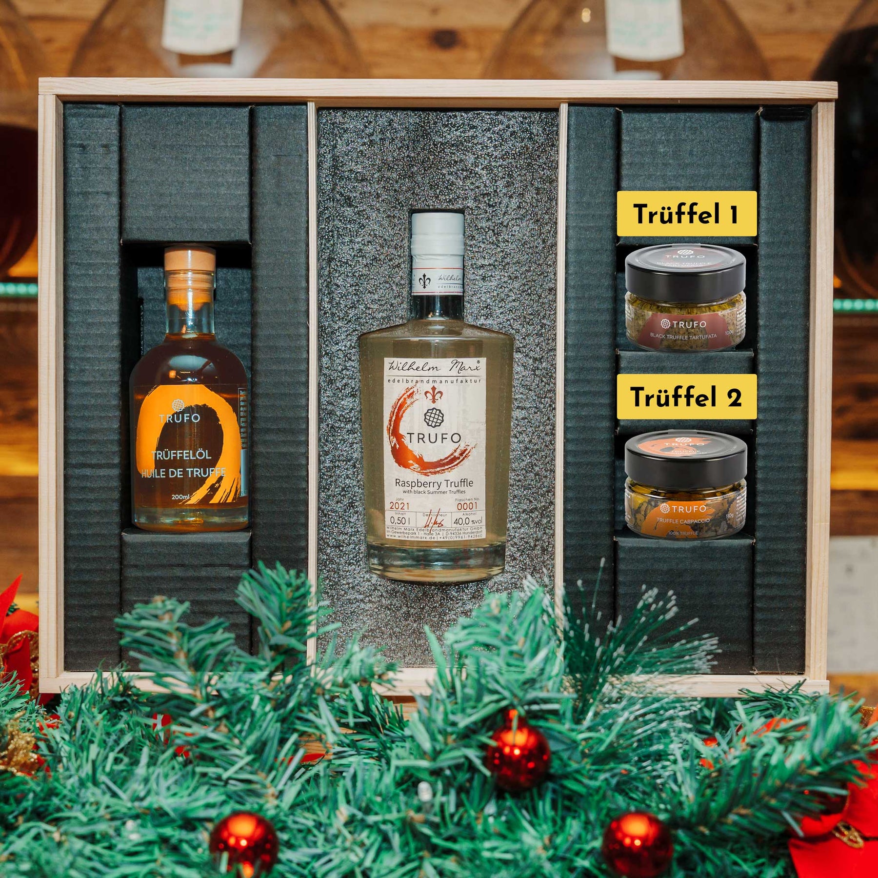 Wählen Sie Ihren Lieblingsbrand – etwa Egg Truffle Cream, Raspberry Truffle, Truffle GIN oder Truffle Liqueur – und kombinieren Sie ihn mit zwei Trüffelprodukten Ihrer Wahl. Das edle Trüffelöl ist in jeder Box bereits enthalten.